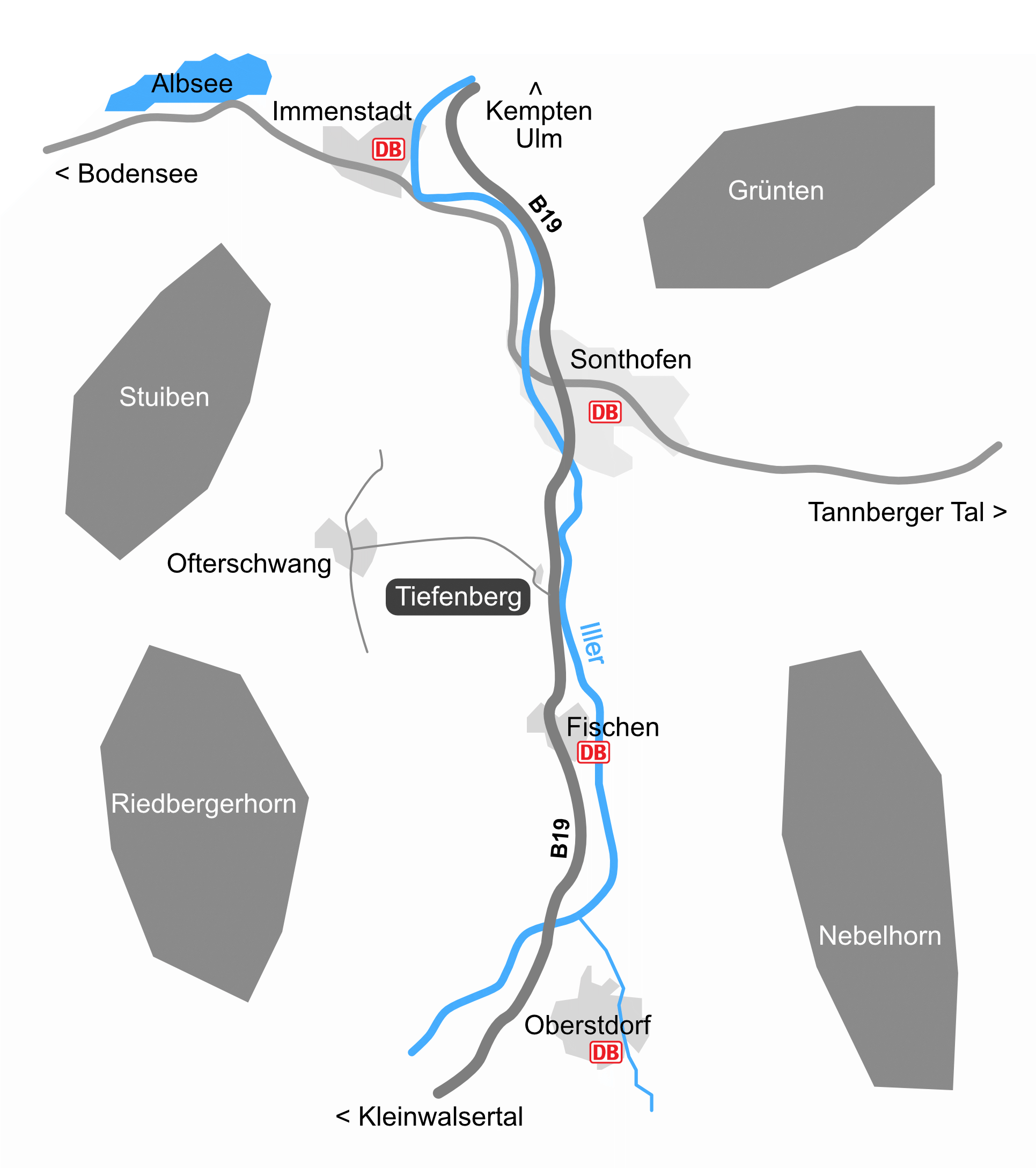 Sonthofen, Radweg entlang B19 in Richtung Oberstorf, in Tiefenberg, der Hauptverkehrsstraße berghoch folgen, bei Linkskurve geradeaus die kleinere Straße nehmen